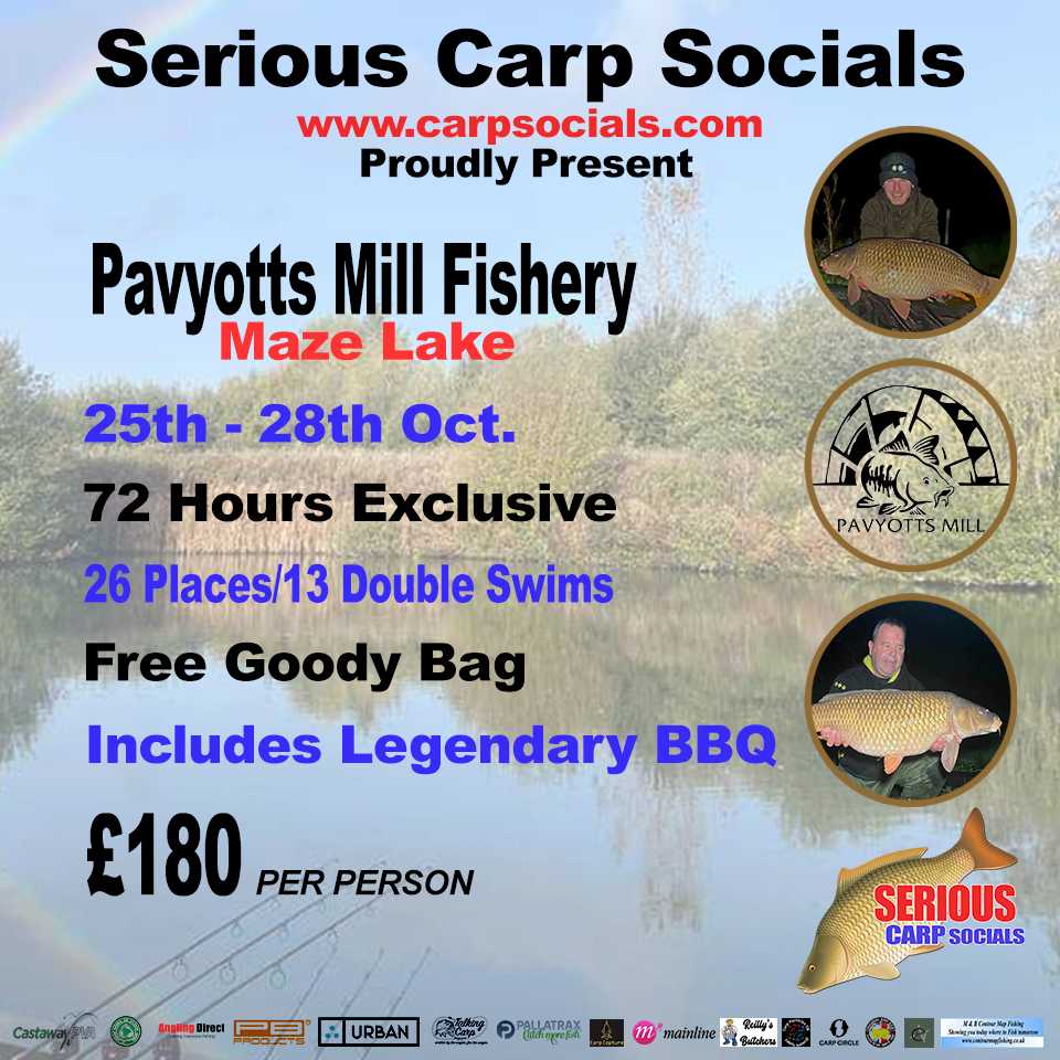 / October 25th- 28th: Pavyotts Mill Fishery – 72 hour EXCLUSIVE. Note: price is for one swim. You may have to share a double swim with a stranger.